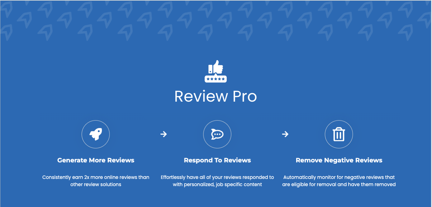 Your online reputation is a strong factor when potential customers choose you or your competitor. But managing that reputation through generating reviews, responding thoughtfully, and protecting yourself from unfair negative reviews requires hours you don't always have. That's why we built Review Pro: the only reputation management solution designed specifically for large multi-location businesses, PEs, franchises and home services companies that addresses the complete review lifecycle.
